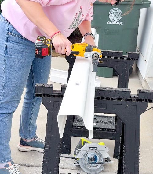This is luckily a relatively easy project. I went back and forth on how exactly I was going to do this but finally landed on using a vinyl gutter instead of wood so I could paint it, it would be easy to work with and and it would be pretty cheap to make. I found a few vinyl gutters at Lowe's, cut them into 24" pieces. I started with my circular saw which did NOT go well at all. It ended up creating a misshapen piece with ridges that were splitting. So I switched to my multi-tool which made much cleaner cuts until I had 10 pieces total.
