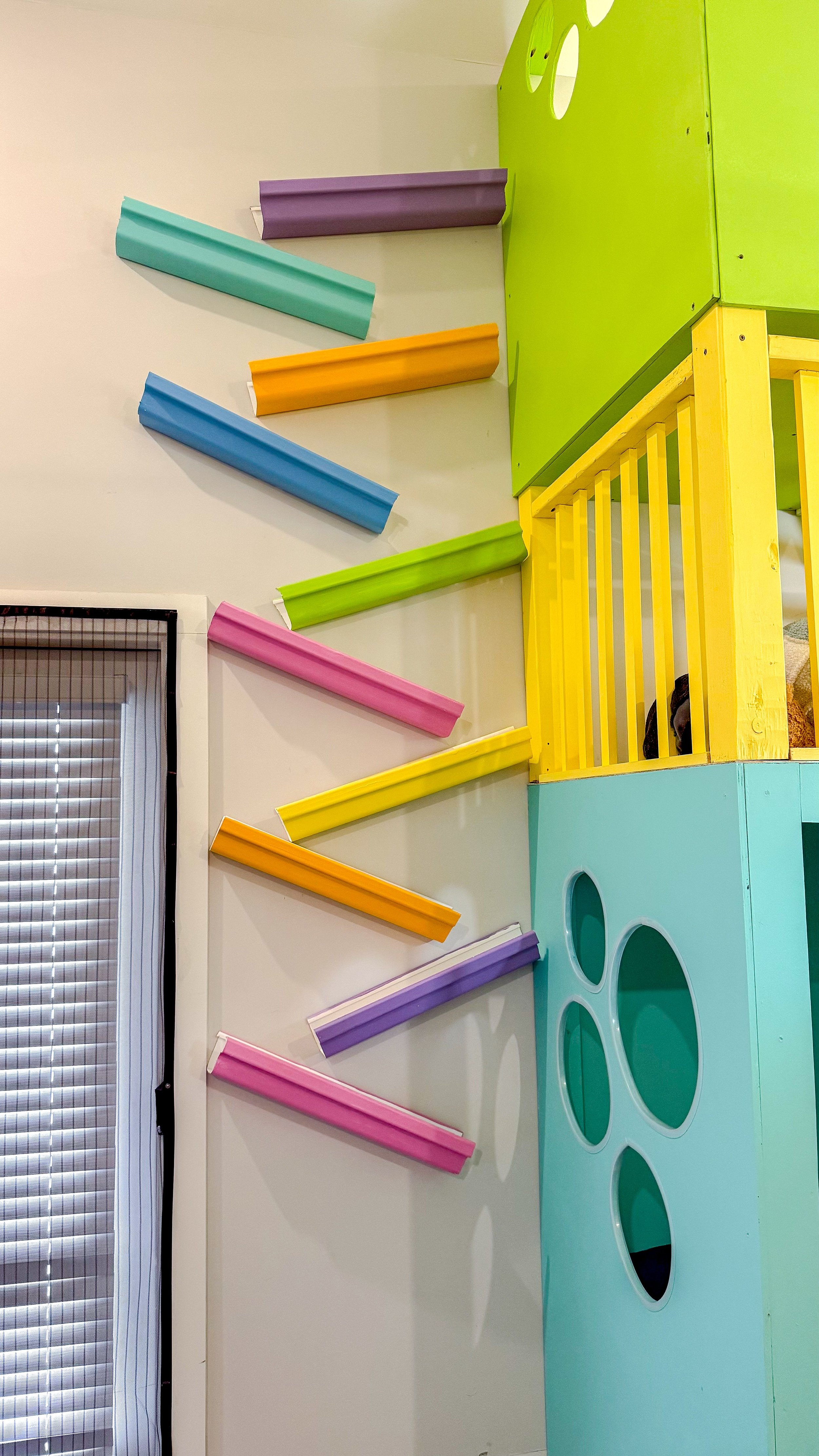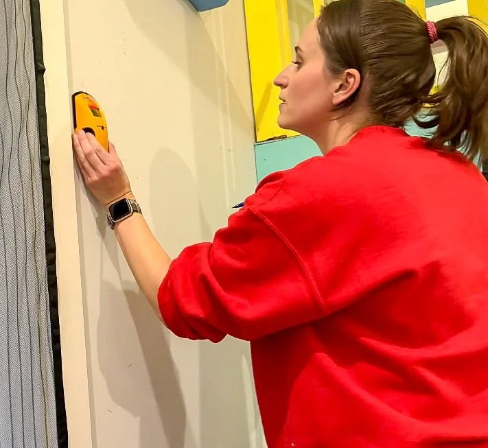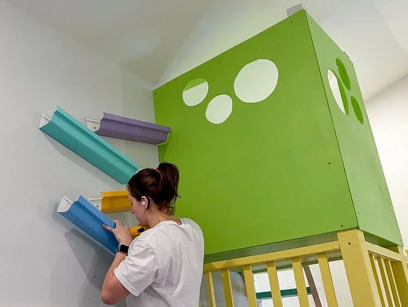 I originally wasn't planning to use the two extra but I painted them just in case and was really glad I had them once I got to assembly. I knew early on I wanted to put the ball run in between the door and bed in the loft area. Once I had everything upstairs, I measured the distance between the studs so I had at least one screw in a stud for each rail. Then I pre-drilled holes, something I thought would make it extra easy to drill holes high on the wall, but it ended up not making much of a difference.