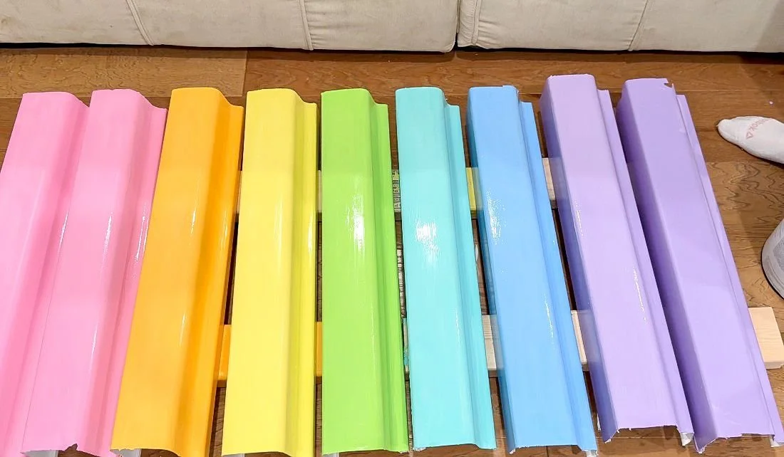 I primed everything with two coats of primer and then was able to use the paint that is already featured in the room to paint the rails. I used Honeybell, Limon, Willow Springs Green, Coastal Paradise, Sea to Shining Sea, Mighty Aphrodite, plus Island Sunset all by Benjamin Moore and painted two coats on each piece. Both Island Sunset and Mighty Aphrodite got two gutters each while the rest of the colors only had one.